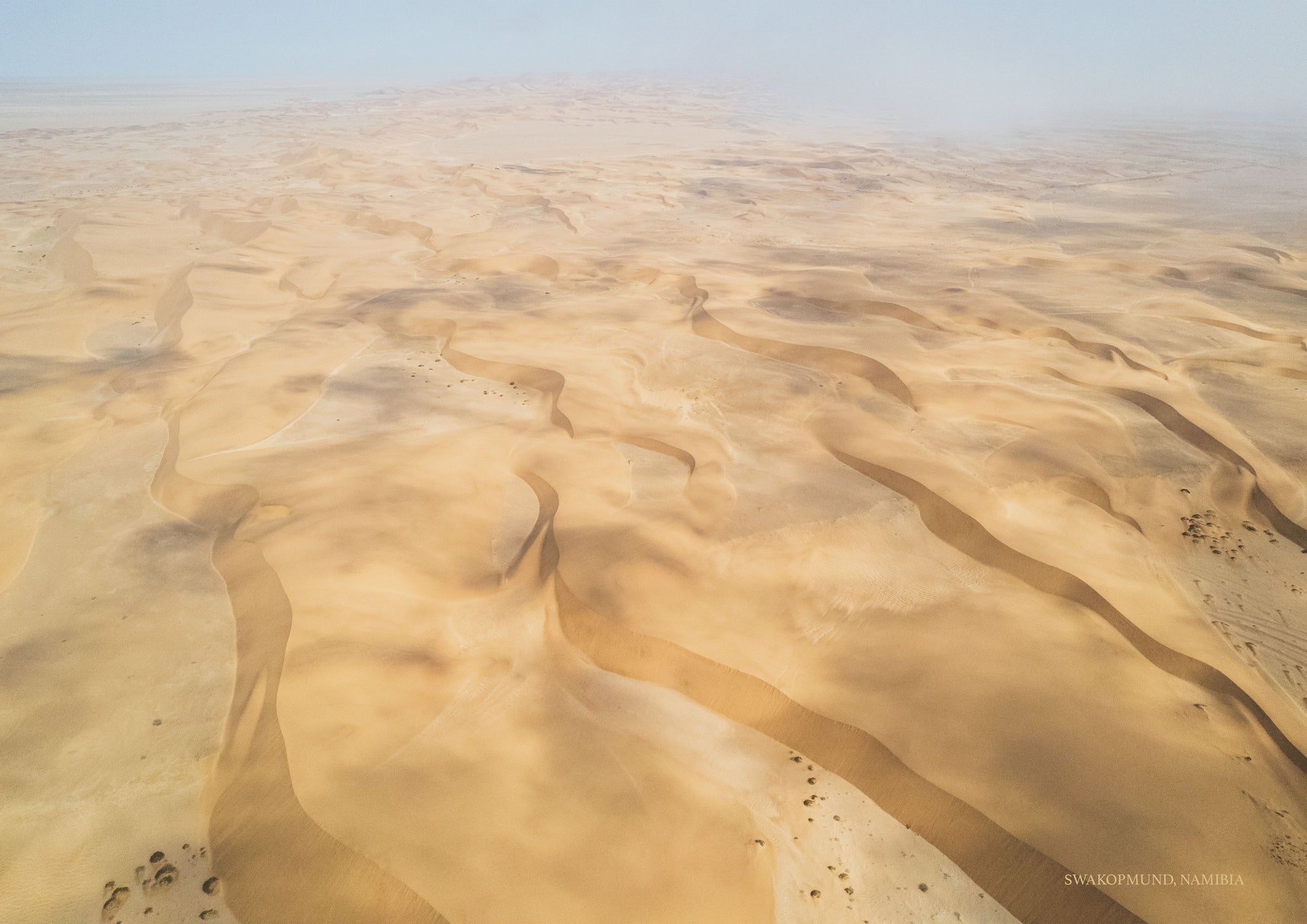 "Direkt an der südlichen Stadtgrenze Swakopmunds türmen sich die Sanddünen auf – so weit das Auge reicht. Der kühle Westwind treibt die Feuchtigkeit vom Meer in die Wüste, sodas der Horizont seichtem Nebel verschwindet. Eine einmalige Kulisse."